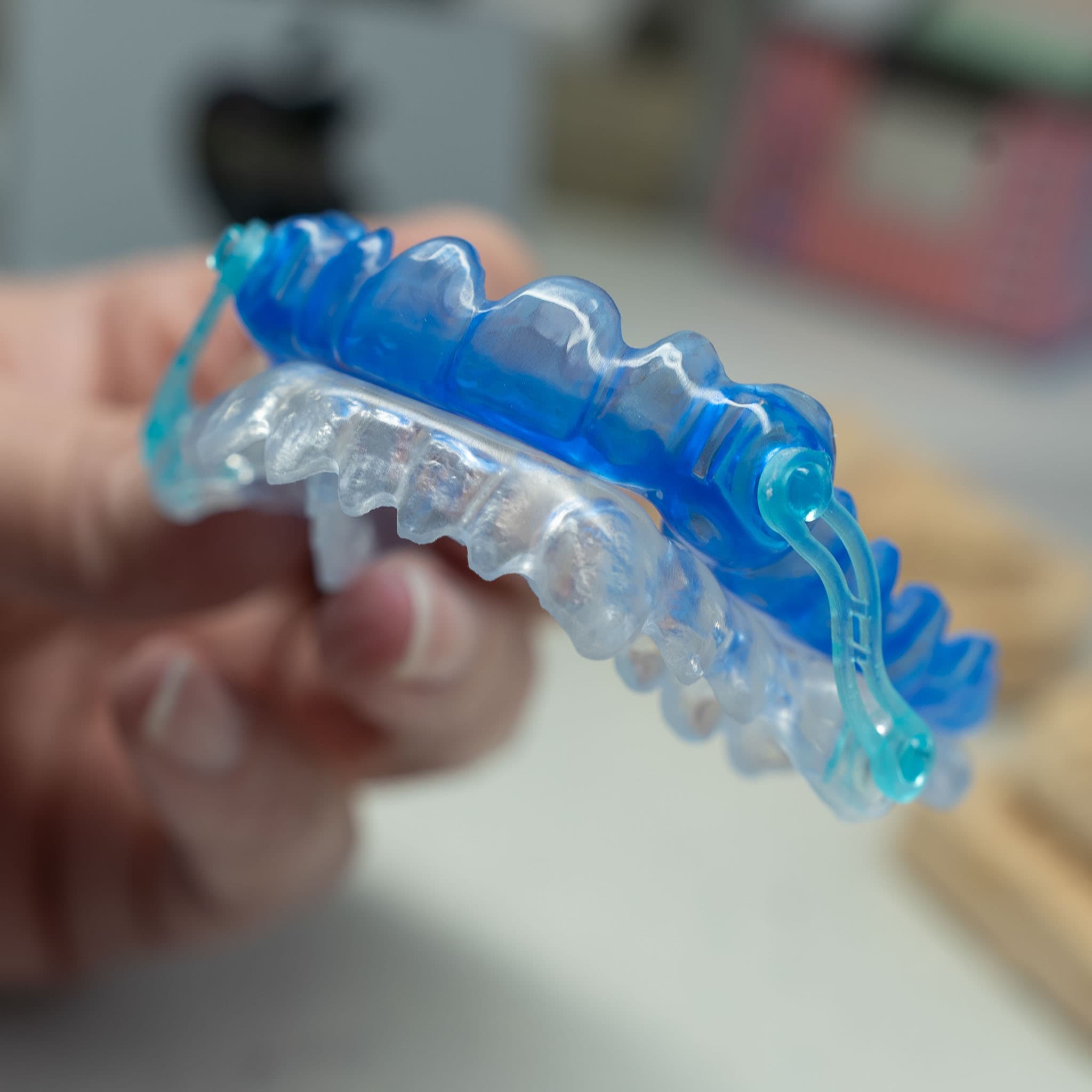 Individuell gefertigte Schienen für Ober- und Unterkiefer die durch eine Verbindung den Unterkiefer leicht nach vorne verschiebt. Dadurch bleiben während des Schlafs die Atemwege offen und Schnarchen wird reduziert.